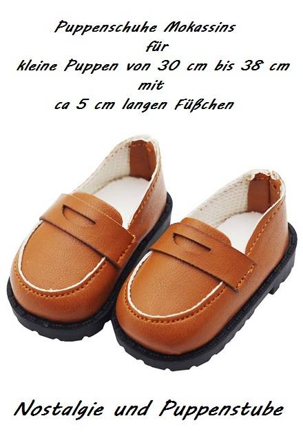 Puppen Schuhe Mokassins Slipper braun für Puppen von 30 bis 38 cm mit 5 cm langen Füßchen, Nr. 2502